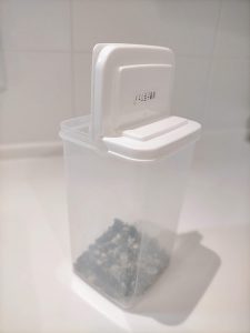 袋のままだと使い勝手が悪いので、ダイソーのロックポットに入れています。