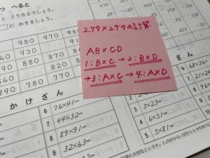 でも、2桁×2桁のかけ算を習っている今は、そろばんを習ったことのないわたしには解き方自体が分からないため、宿題はノータッチ。